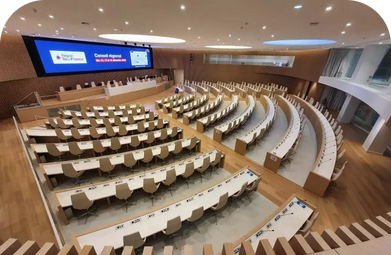 The camera tracking or integrated uniCOS & Lumens or other cameras focus on each speaker, enhancing visibility and making meetings more personal and impactful. Central equipment and video interfaces connect remote attendees, making them feel as if they are in the room. Interpretation equipment supports multilingual discussions, breaking down language barriers for inclusive collaboration.
